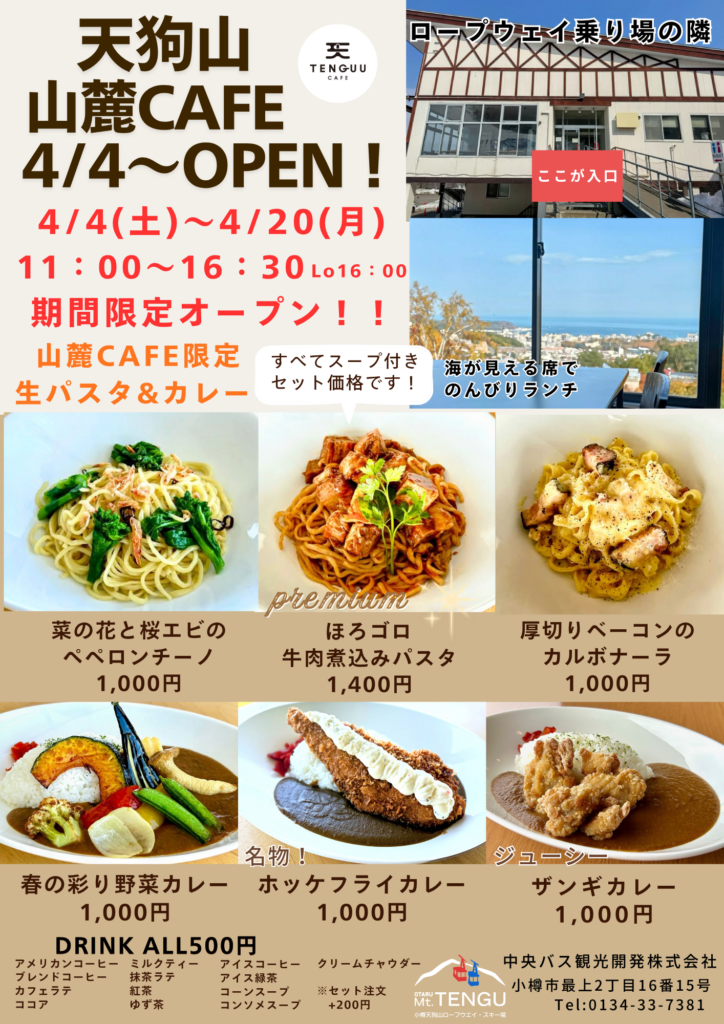 4/20まで期間限定『天狗山山麓CAFE』OPEN中! 2026.4.7 NEWS ロープウェイ乗り場隣に『山麓CAFE』がOPEN中です! 人気のカレーに加え、野菜カレーがパワーアップ🍛 さらに!「ほろゴロ牛肉煮込みパスタ」など絶品生パスタ3種も新登場✨ お手頃なスープセット付きでご提供します! 春の美味しい時間をお見逃しなく、ぜひお越しください。